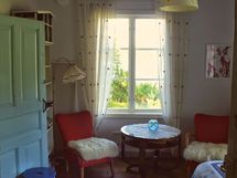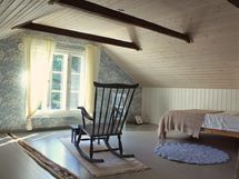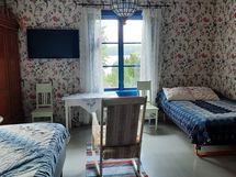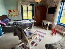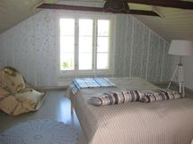Ihana kesähuone, jonka isoista päätyikkunoista valloittavat maisemat merelle ja omenapuutarhaan. Huoneessa on 120 cm:n ja 140 cm:n levyiset parisängyt, työpöytä ja lukutuoli.