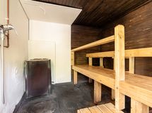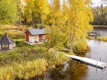 RANTASAUNA: Kaitalammin rannassa sijaitseva puulämmitteinen rantasauna on varustettu omalla kylpypaljulla, juoksevalla lämminvedellä ja suihkulla. Saunan takana on tulisija grillaukseen.