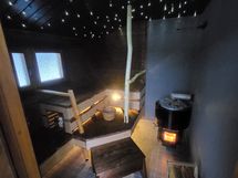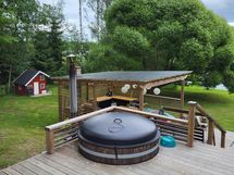 Saunassa puukias/vesipata yhdistelmä. Päämökin yhteydessä iso terassi oleskelu sohvien ja paljun kera, paljun täyttö järvi vedellä kuuluu hintaan. Paljussa uima-allas suodatus järjestelmä.
