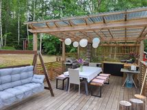 Terassi yhdistyy portailla isoon katettuun kesäkeittiöön, jossa ei vesisade haittaa. Kesäkeittiössä iso ruokailuryhmä, kaasugrilli, tuli grilli/liesi taso ja 2 x jääkaappi.