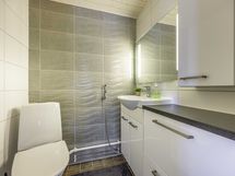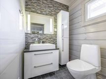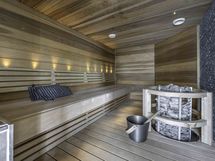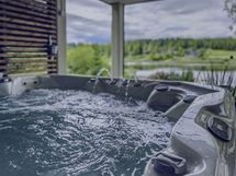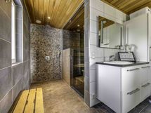 Alakerrassa on kodinhoitohuone pesukoneella ja kuivauskaapilla, suihku ja tilava tyylikäs sauna ja wc. Saunasta pääset suoraan vilvoittelemaan terassille tai pulahtamaan poreisiin tai järveen, jossa