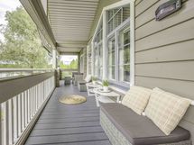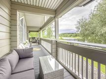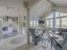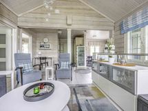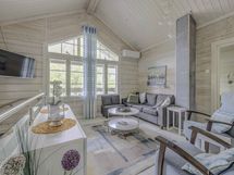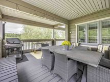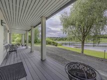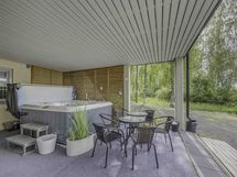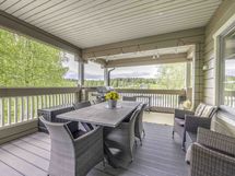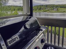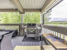 Keittiöstä käynti huvilaa kiertävälle katetulle terassille, jossa ruokailuryhmä ja kaasugrilli ja oleskeluryhmä järvinäkymin. Olohuoneessa on työskentelypiste, netti ja smart-tv jossa myös Netflix liittymä tunnuksineen vieraiden käyttöön