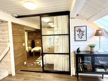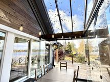 Talon edessä, järven äärellä on hulppea terassi, joka on osittain lasitettu. Käynti ruokapöydällä varustetulle lasitetulle terassille on suoraan olohuoneesta.