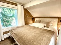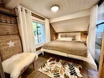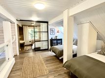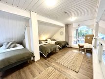 Yläkerrassa on yksi liukuovella suljettavissa oleva makuuhuone, jossa parivuode sekä säilytystilaa. Yläkerran parvella on lisäksi 3 yhden hengen vuodetta. Takka-leivinuuni, sekä TV 55", free Wi-Fi.