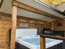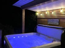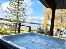 Terassilla sijaitsee myös iso, 6 hengen katettu ulkoporeallas. Ulkoporealtaalle käynti on mukavasti sauna-pesuhuoneosastolta.
