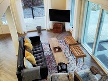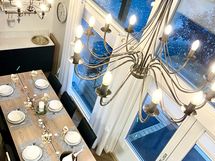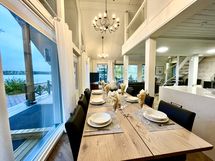 Alakerrassa on iso, yhdistetty olohuone- ja ruokailutila, sekä keittiösaarekkeella ja baarinurkkauksella varustettu avokeittiö. Keittiössä on kaikki tarvittava ruoanlaittoon, sekä astiat ja ruokailuvälineet viini- ja sampanjalaseineen.