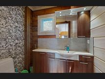 -keittiö: jääkaappi/pakastin, astiasto, sähköhella, mikroaaltouuni, kahvinkeitin, vedenkeitin, leivänpaahdin, astianpesukone