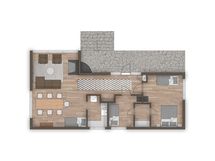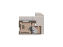 Mökki on yhdessä kerroksessa. Mökissä on valoisa olohuone ja ruokailutila, pieni keittiö, 2 makuuhuonetta ja vaatehuone. Pohjakuva suuntaa antava.