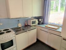 Keittiön varustukseen kuuluu jääkaappi-pakastin yhdistelmä, hella, mikro, kahvinkeitin, vedenkeitin sekä keräilyerä astioita.