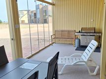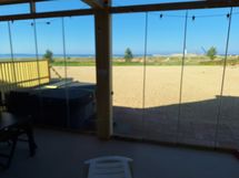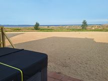 Hiekkaranta alkaa, kun astut terassilta alas. Merelle on matkaa vajaa 100 m. Meri näkyy hyvin ala ja yläkerrasta sekä pihalta. Koko takapiha on hiekkaa, joka ulottuu mereen saakka. Rauhallinen tontti,