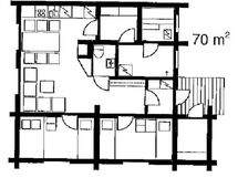 Huoneistossa on 2 makuuhuonetta, olohuone, reilun kokoinen avokeittiö ja sauna. Toisessa makuuhuoneessa on 160 cm leveä parisänky ja 80 cm leveä parvisänky. Lisäksi tässä makuuhuoneessa on pieni työpiste. Toisessa makuuhuoneissa on 120 cm leveä sänky ja kerrossängyt. Yhteensä makuupaikkoja on siis 6.