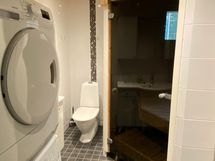 Suihku, Kuivausrumpu, Pesukone, Peilikaappi, Laattalattia, Halogeenivalot, Allaskaappi, Laattaseinä, Erillinen WC, Lattialämmitys