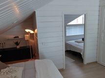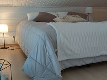 Yläkerrassa ilmavalla parvella parisänky ja erillinen makuuhuone kahdella erillisellä sängyllä. Parvella lisäsänky taitettuna istumatuolina jonka voi tarvittaessa ottaa käyttöön viidenelle nukkujalle.