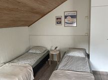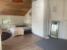 2*80*200cm sänkyä, mahdollisuus kahteen lisäpatjaan, keittiön pöytä ja neljä tuolia, vaatekomero, lipasto, 32”TV, jääkaappipakastin, pyykinpesukone, kahvinkeitin, vedenkeitin, mikrouuni, liesi.