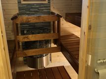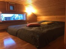 Yläkerrassa parvi, jossa neljä makuupaikkaa sekä erillinen parvi olohuoneessa, jossa kaksi makuupaikkaa, olohuoneessa vuodesohva.