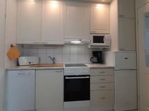 Huoneistossa on jenkkijääkaappi, keraaminen liesi, uuni, mikro, leivänpaahdin, kahvin- ja vedenkeitin, sähkövatkain, astianpesukone, silitysrauta ja -lauta, hiustenkuivaaja, tilava kuivauskaappi, tv, dvd ja radio.