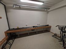 -pyörä- ja suksivarasto, jossa myös suksien voitelutila