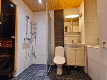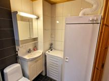 -kylpyhuone: vaatteiden kuivauskaappi, uusi laadukas AEG-pyykinpesukone sekä hiustenkuivain. Juuri uusittu Oras-suihkusekoitin.