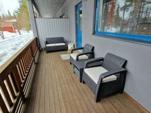 -leveä kalustettu terassi, josta näkymä takapihalle ja Jounin kaupalle