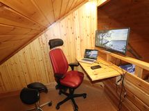 Yläkerrassa "toimistotila": työpöytä + kaareva laajakulmanäyttö + nahkainen Kinnarps toimistotuoli (+ ainakin toistaiseksi myös Sally satulatuoli)
