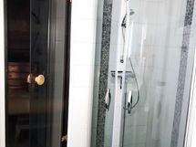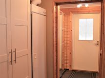 Alakerrassa olohuone, keittiö, makuuhuone ja saunaosasto jossa myös WC. Alakerran makuuhuoneessa parivuode.