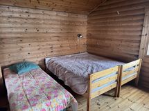 3 yksittäistä siirrettävissä olevaa sänkyä tuvassa ja 2-3 hengen makuuparvi.