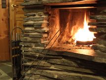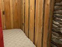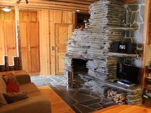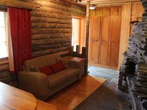 Takahuoneessa kerrossänky, takan takana makuusoppi ja olohuoneen sohva avattavissa (yht. 6 nukkumapaikkaa)