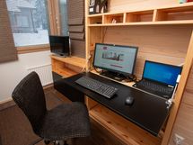 Työpisteen varusteina on näyttö, näppäimistö ja hiiri, työtuoli sekä nopea internet-yhteys (4G + Wi-Fi). Mökillä on kätevä yhdistää etätyöt rentouttavaan liikuntalomaan vaikka pidemmänkin aikaa tai antaa muun perheen nauttia lomasta osan tehdessä töitä.