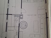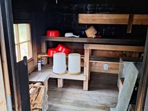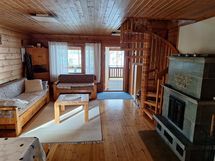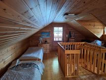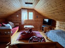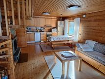 Mökin alakerrassa tupakeittiö ja pieni makuuhuone, jossa parisänky (140cm). Parvelle noustaan kierreportaita ja siellä on kaksi (80cm) leveää sänkyä ja levitettävä sohva.