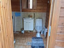 Alakerrassa erillisen sisäänkäynnin kautta pesuhuone, jossa WC ja sauna. Pesuhuoneessa suihkukaappi ja sauna lämpiää puulla.