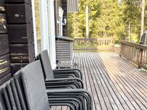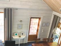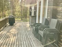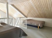 Yläkerrassa tilava parvi. Makuutilat ja ruokailuvälineet(reilusti) 8hlölle + patja. Iso kuisti.