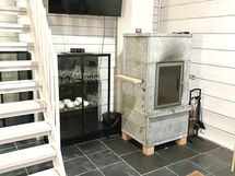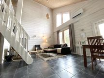 Alakerrassa tilava olohuone, johon yhdistettynä ruokailutilat, keittiö, takka,
