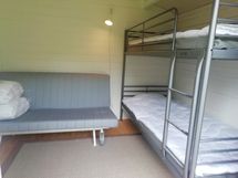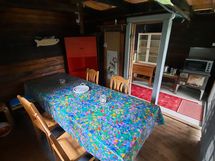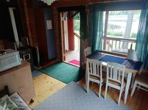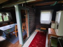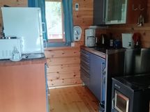 Tupa, jossa keittiönurkkaus, tiskiallas, jääkaappipakastin, mikro, puuliesi, astiasto 6 hengelle, kahvin- ja vedenkeitin, sekä avattava vuodesohva kahdelle.