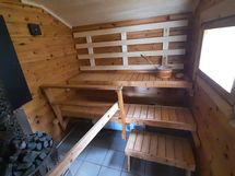 Mökki 30 m², puulämmitteinen moderni sauna ja kaakeloitu pesuhuone, jossa on suihku ja polttava WC kylpyhuoneen yhteydessä. (lisäksi ulkohuussi)