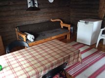 Tainijoen rannalla sähköistetty saunamökki ja aitta.