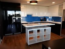Laminaattitasot, Suuri tiskipöytä, Paljon kaappitilaa, Paljon työskentelytilaa, Astianpesukone, Integroidut koneet, Jääkaappi, Keraaminen liesi