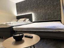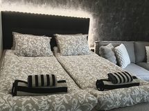 Varustelusta löytyy mm pesukone, kuivausteline, hiustenkuivain, kahvinkeitin, vedenkeitin, leivänpaahdin, iso 75” smart TV, WI-Fi ym..