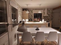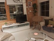 Kevyttakka, ilmalämpöpumppu, TV, DVD, tiskikone, mikro, jääkaappipakastin, induktioliesi, kiertoilmauuni, pesukone, kaasugrilli jne.