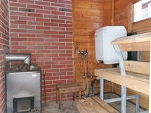 Puilla lämpiävä kiuas, suihku ja vesivaraaja.