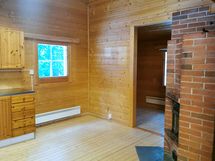 Tupakeittiössä lattiassa lauta ja katto paneloitu. Varustuksena jääkaappi. Lämpöä tuomassa iso varaava takka.